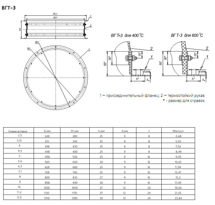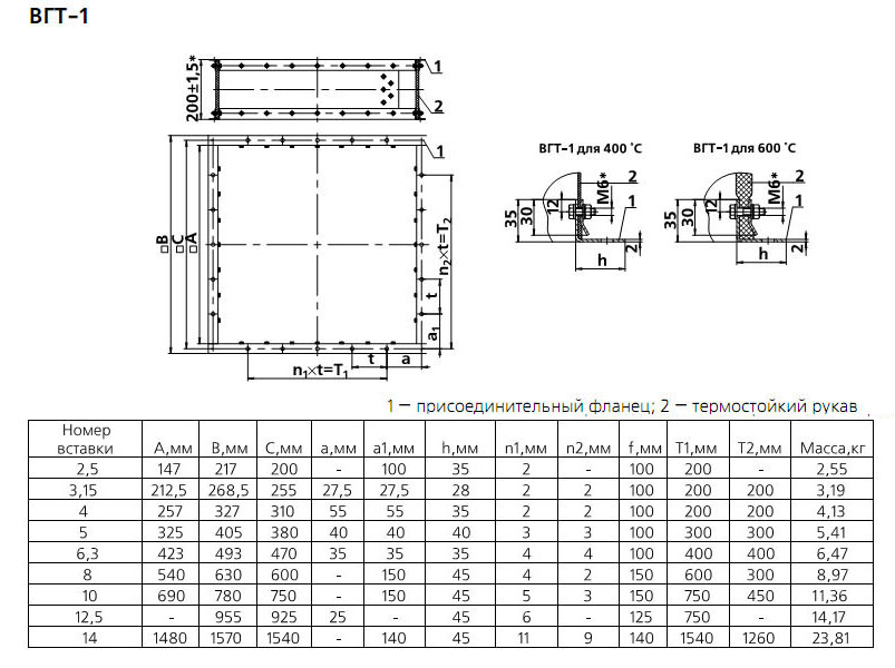 Компенсаторы огнестойкие состоят из термостойкого рукава и стальных оцинкованных фланцев. Вставки разных размеров могут иметь квадратное (ВГТ-1), прямоугольное (ВГТ-2) и круглое (ВГТ-3) сечения. Гибкий рукав вставки состоит из слоев специальных материалов. В зависимости от их комбинации возможно исполнение гибких вставок термостойкостью +400, +600 и +1000С. Материалы гибкой вставки могут быть кислотостойкими и выдерживать воздействие других арессивных сред.