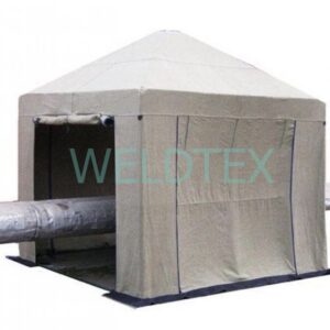 Сварочная палатка представляет из себя металлический каркас покрытый тентом, выполненным из брезентовой ткани со специальной огнеупорной пропиткой или из ткани ТАФ с огнеупорной пропиткой, так же возможно изготовление сварочной палатки на основе полностью негорючего материала Weldtex. Каркас палатки сварщика выполнен из стальной трубы диаметром 18 мм и 22 мм. Для повышения прочности каркас имеет нижнее основание и верхнюю обвязку. Элементы каркаса палатки сварщика соединены между собой при помощи кнопок-защелок. Крестовины выполнены из стальной трубы увеличенной толщины.