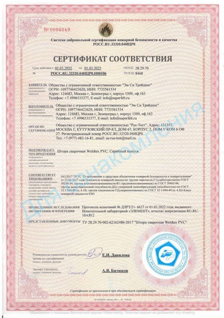 Сварочные шторы прошли необходимые испытания в пожарной лаборатории, которые подтвердили степень пожарной опасности КМ1 — слабогорючий материал.